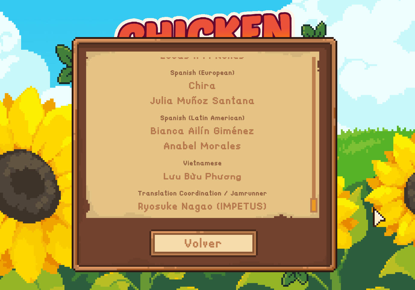 Charming chicken discovery game I revised and edited in July 2022 and September 2023! Chicken Journey was about 10,000 words long, and I was also in charge of the LQA procedures! It was a pleasure to work with Bianca Giménez; we both grew with this experience. This was part of a Localization Jam hosted over at the YakYak server. Go check Chicken Journey's Steam page, it's already out, and ready for you to play it!